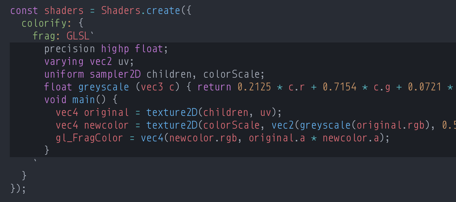 language-babelto addGLSL:source.glslin settings “JavaScript Tagged Template Literal Grammar Extensions“. - (Bonus) Add this CSS to your Atom > Stylesheet: